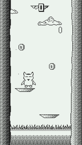 A vertical infinite platformer, some platforms fall, the spike should be avoided, collect coins to get a boost and buy some cool items while rest in his house.